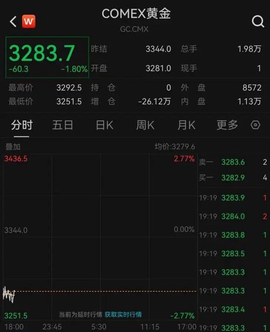 COMEX黄金期货主力合约同样承压。5月12日,COMEX黄金期货主力合约低开近2%,现报每盎司3283.7美元,单日涨幅为1.8%。