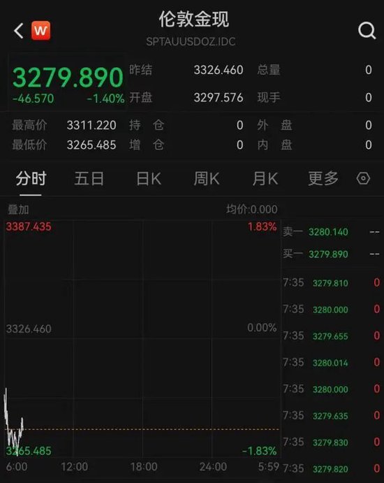 5月12日,伦敦金现开盘即现颓势,低开幅度超1%,随后跌幅进一步扩大至1.8%,价格一度跌破每盎司3270美元。截至记者发稿时,伦敦金现报每盎司3279美元,延续震荡行情。