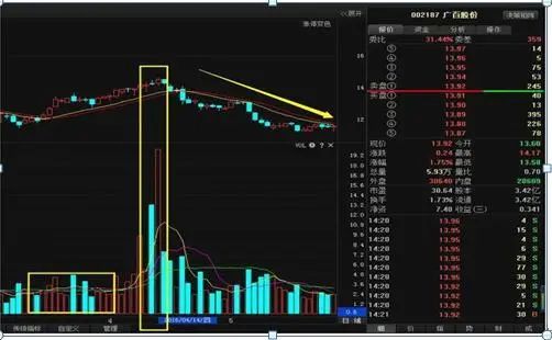3、股价小幅上涨当日成交量相对前期大阳线时成交量放大超倍,此情况多为主力对倒筹码,趁机出货所谓。