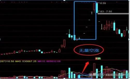 第八式:无量空涨、无量空跌。主要是指个股(或大盘)在无成交量或极少成交量的情况下,价格却大涨(跌)的量价配合现象。特征:无量空涨、无量阴跌通常是在突发性政策等利好(利空)情况下出现的。无量上涨意味着后续还会强势上涨,无量下跌意味着后续还会下跌。