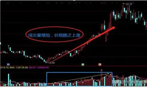 第三式:量增价涨。主要是指个股(或大盘)在成交量增加的同时、而个股的股价也同步上涨的一种量价配合现象。特征:量增价涨只出现在上升行情中,而且大部分是出现在上升行情的初期,也有小部分是出现在上升行情的中途。随着成交量的逐渐放大,股价也开始缓慢向上攀升,股价走势呈现量增价增的态势,这种量价之间的良好配合,对未来股价的进一步上扬,形成了真实的实质性支撑。
